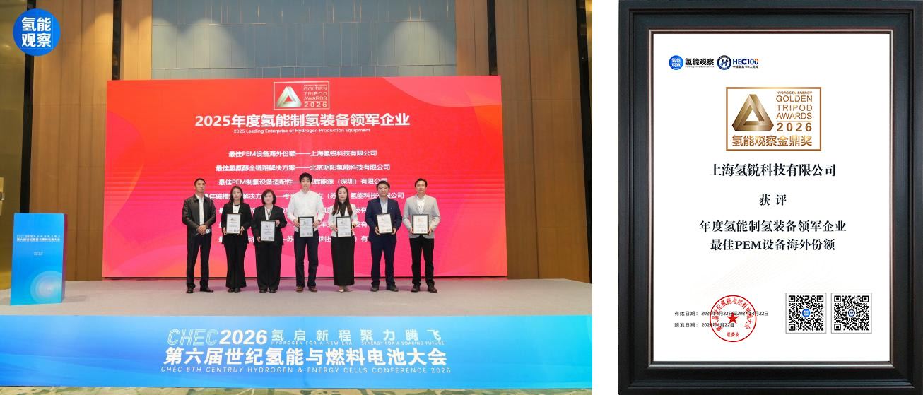 近日,在2026第六届世纪氢能与燃料电池大会上,上海氢锐科技有限公司(以下简称“氢锐科技”)凭借在海外市场取得的多个订单成果脱颖而出,荣获“年度氢能制氢装备领军企业——最佳PEM设备海外份额奖”。该奖项由行业权威机构“氢能观察”及“中国氢能100人论坛”联合颁发,旨在表彰在推动中国PEM制氢产品走向国际市场方面表现突出的企业。此次获奖,标志着氢锐科技的国际化能力和产品竞争力获得行业高度认可,此次获奖既是对过往成绩的认可,也是对公司聚焦PEM核心技术、深耕全产业链、布局全球市场战略方向的积极反馈。